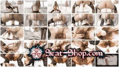 QS hasnt shaved her pussyhair for several months. She sits in a long dildo put on a transparent chair while pushing out a boozy chocolate induced shit/diarrhea mix, which she spreads into her hairy pussy. After that she dips the dildo in the shit and pushes it up into her vagina, repeating the dipping several times. Then she stuffs the remaining shit up into her vagina and finally she pushes it out.
