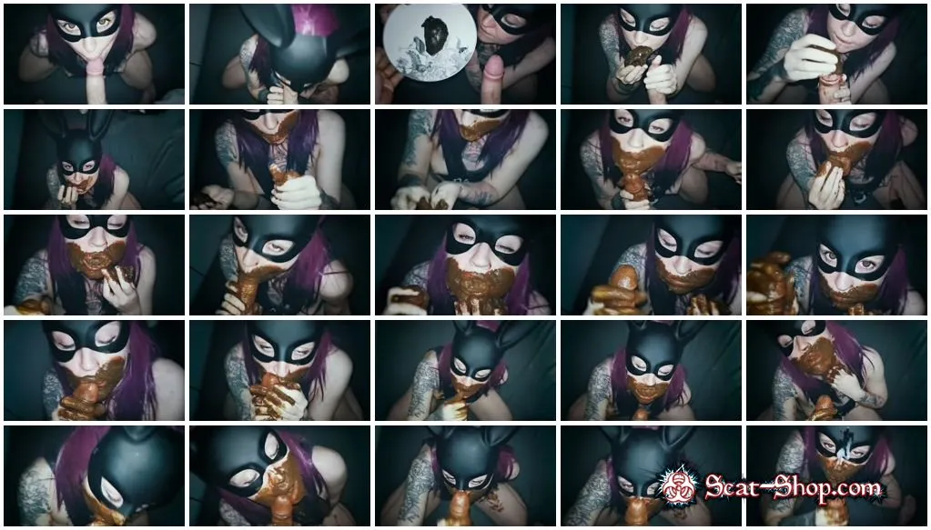 A girl in a rabbit mask gently coats her husband’s cock with fresh shit, greedily pushes it into her mouth, enjoys dirty saliva, and eats a mouthful of tart shit. You can see how the shit slowly melts in her mouth as she swallows the cock deeper. Then she gets a warm stream of cum on her mask and enthusiastically licks a dirty cock stained with fresh sperm. Extreme Homemade Scat Swallowing Dirty Toilet Fetish Copro Caviar Blowjob Underground Atmospheric Amateur SCAT Girl Poop Smearing Licking Sucking Own Shit